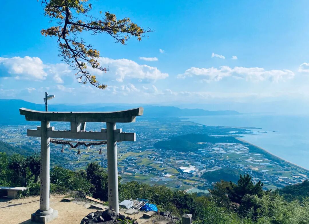 从标高407米的本宫(神社主殿)望去,观音寺市内及美丽的濑户内海都尽收眼底。从神社的鸟居看去,背景是蓝天白云碧海,如同建在天空中的神社,风光无限,非常适合拍照。