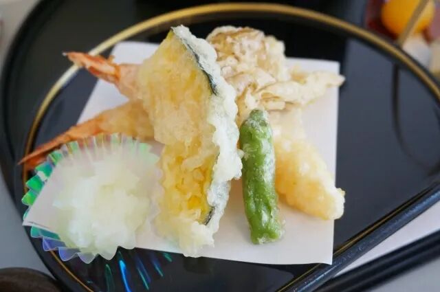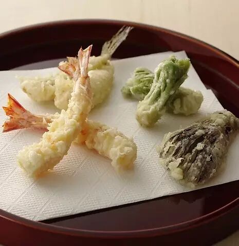 好的天妇罗端上桌,纸上可以不沾一滴油,嫩嫩的食材透过金黄薄衣若隐若现,仿佛少女般水灵粉嫩。日本现在最有人气的是什锦天妇罗,可蘸调料萝卜泥等趁热单吃,也可以放在米饭上,盖在荞麦面碗上,气派雍容,灿烂夺目。