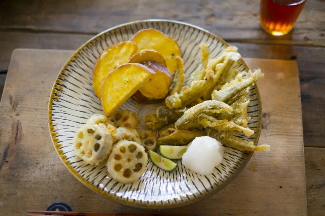 而如今,广受欢迎的天妇罗材质丰富,去了壳的虾、鱼肉、鸡等等都可以拿来挂面糊油炸,这种挂糊做法始兴于18世纪。后来,又出现了牛蒡、菌菇、南瓜、红薯等蔬菜天妇罗,外脆里柔很受欢迎。