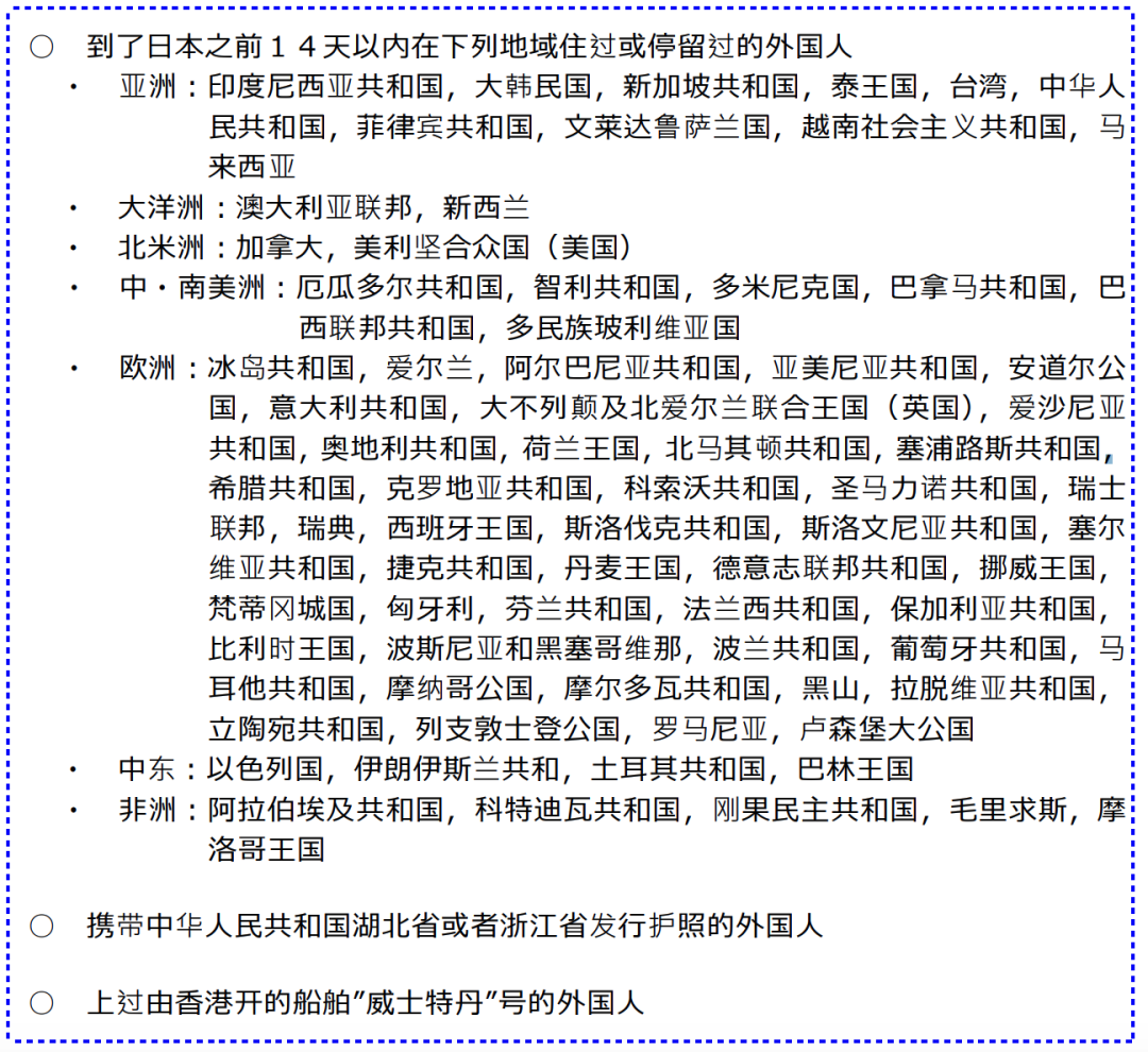 将成为拒绝入境的对象。请现在滞留本国的人士避免前往导致拒绝入境的对象地区。特别永住者不属于入管法第5条第1项的审查对象,不会因上述政策拒绝入境。