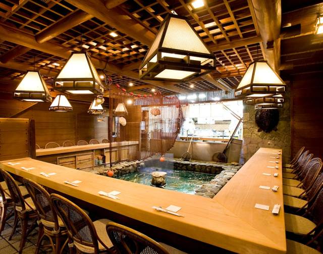 店内的活海鲜水池,可以让客人一边看着眼前的海鲜,一遍品尝美食。店内建筑风格也是传统的日本木造风格。