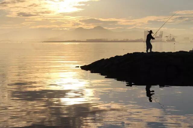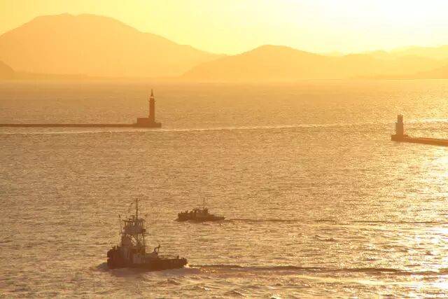 在2015.10.6搭乘遊輪到達福岡港口,夕陽下的海事船顯得平凡中的美麗,夕陽照射下的海平面如同美麗的衣裳,閃閃發亮如同福岡自然風光帶動旅客的心,平靜而美麗。