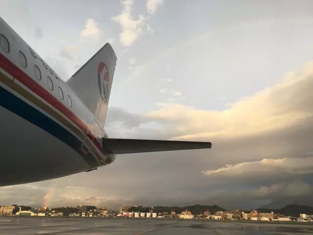 福冈上空难得一见的彩虹之桥,正好映衬出飞越两地的航空公司