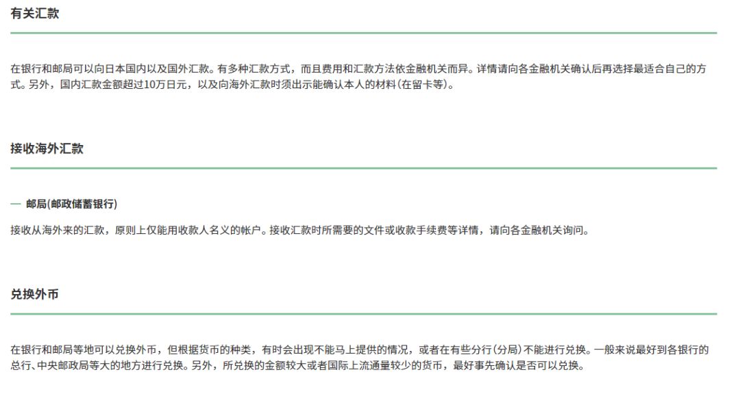银行和邮局(邮政储蓄银行)提供如存款、水电煤气费等的银行自动转账、信用卡自动转帐、汇款等各种银行业务服务。一般银行的营业时间为上午9时至下午3时,邮局的储蓄窗口到下午4时(有的店铺到下午6时),星期六、星期日和节假日休息。但也有些银行在夜间和星期六、星期日等开门营业。如申请存取款卡,即使在窗口的营业时间外,也可以通过ATM(自动存取款机)和CD(现金自动取款机)存款或提款。另外,各金融机关还利用因特网和手机提供各种服务。