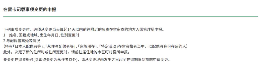 合法的在留3个月以上的外国人,初次在入国港上陆许可的话,将交付在留卡。(但是,2016年6月的信息,入国时交付在留卡的只有成田、羽田、中部、关西、新千岁、广岛、福冈7个空港。)有在留卡的人决定住址之日起14日以内,持在留卡到居住地区的市区町村役所市民课向法务大臣申报。申报之后,和日本人一样可以申请住民票。在住民票上记载的地址就成为接受福祉以及教育等所有行政服务时的基本。护照上有「在留卡后日交付」的记载时,决定住址之后,持护照到居住地的区役所市民课登记住址。登记之后,给本人邮送在留卡。 取得在留资格变更许可时,同样也需要提出住址变更的申报。