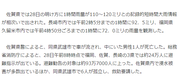 并且声称这是有史以来最大的降雨。并且对24万人进行紧急避难的指示,对93万7000人以上进行避难劝告。在佐贺县内已经有很多人提出了被淹求助以及在武雄市有6人被困请求救援。