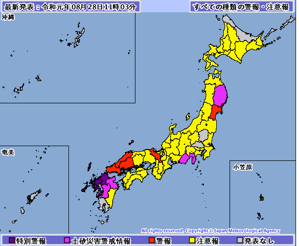 目前已经发布大雨特别警告⚠的地区有:福冈县筑后地区以及,长崎县北部,上五岛地区和佐贺县。需要注意的是,福冈其他没有通知的地方和大分县也要引起注意。气象厅呼吁大家平时积极去气象厅的网站了解有关天气的详情,已被不时之需。