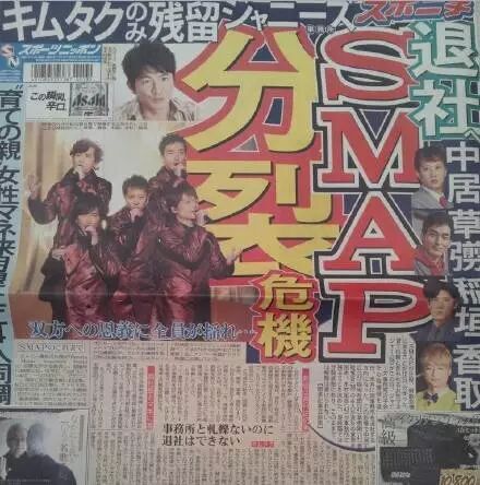 据日本媒体报道,日本杰尼斯天团SMAP成军27年,在演艺圈的地位一直屹立不摇,13日却被日媒以头版爆料解散,成员中居正广、稻垣吾郎、香取慎吾和草彅刚都将脱离杰尼斯事务所,只有木村拓哉独自留下,“分裂危机”令各地粉丝都十分惊慌,不过事务所目前尚未正式回应。