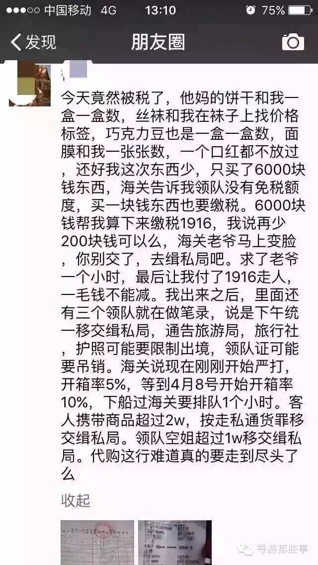 新税制度下导游,领队代购还有明天吗? 分享 2017年6月8日 14.71W 0 下载喵日本APP获得更多日本相关信息,自由行定制微信janson-ren match导游代购 我觉得可以用一首歌来表达领队未来代购情况。那就是没有明天[再见] 今天关于代购被税了,此消息一出震惊了导游圈,领队圈。 还能不能好好出去玩耍带点东西回来了? 此消息已经得到证实,望以后导游领队珍重。 本文转自:导游那些事,版权属于原作者 相聚福冈 日本福冈最大新媒体平台 长按,识别二维码,加关注 赞(0) 赏 分享 本文由 相聚福冈 作者:janson 发表,转载请注明来源!