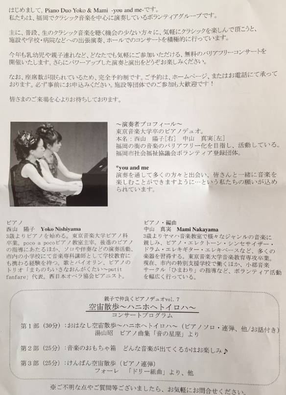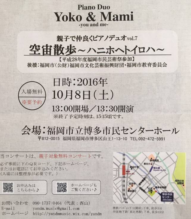 想培养孩子音乐素养就带孩子来吧。 分享 2017年6月16日 14.86W 0 下载喵日本APP获得更多日本相关信息,自由行定制微信janson-ren 10月8日在博多区有一个钢琴音乐会,如果是家长带着孩子参加,提前邮件或电话预约一下的话,可以免费参加! 演奏者之一是福冈信息提供者的女儿的钢琴老师,她说今年会场很大,听众可能坐不满,希望能有更多的家长可以带孩子来听,尤其适合正在学钢琴或乐器的孩子,可以培养他们对音乐的兴趣 。 赞(0) 赏 分享 本文由 相聚福冈 作者:janson 发表,转载请注明来源!