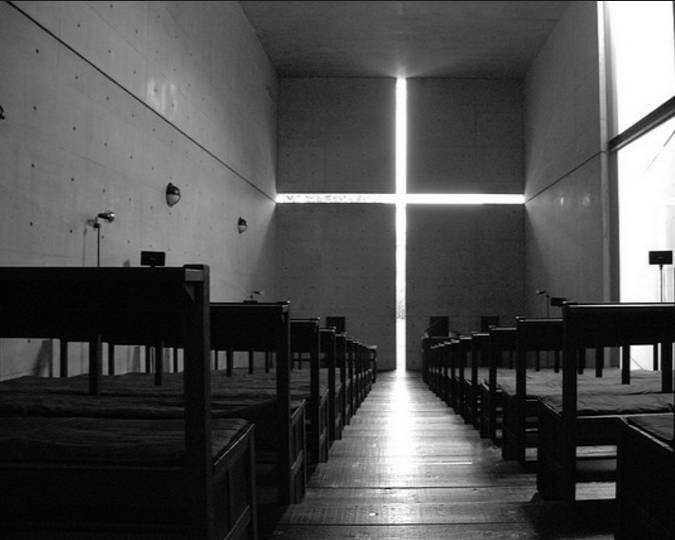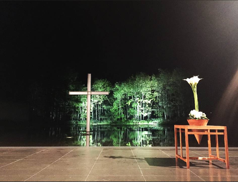 通过楼梯的过度空间,十字架终于呈现在眼前。周围的景致如此简单,只有立于水中的十字架,周围郁郁葱葱的树木,和在灯光下荡漾的水波。在大自然中,人们才可以反思和面对自我。