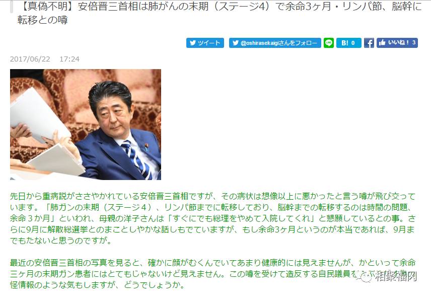 从22日下午开始,日本网络上开始流传安倍得了肺癌还是晚期这一惊天消息。而这则消息来自一位自由记者板垣英宪发表的博文:首相安倍晚期癌症(4期),已经转移到淋巴关节,转移到脑部只是时间的问题,所剩生命只有3个月。