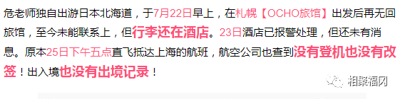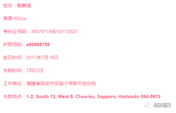 横滨的二姐妹失踪被抛在荒野还没过几天,现在又一位福建的小学语文老师,危秋洁老师来日本旅游,在北海道旅游突然失踪,已经过了4天以上却仍然下落不明!!!