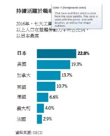 根据经济合作与发展组织(OECD)调查,2016年间超过65岁仍在工作的日本人比例约23%,是七大工业国集团中最高的,美国为19%。