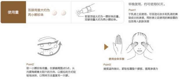 使用量:两眼2粒细珍珠份量(BA精华眼霜的圆形嘴位的大小为一粒珍珠份量)朝晚都可使用