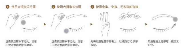 5. 用食指,中指和无名指的指腹,放在眉上以螺旋动作轻按摩。
