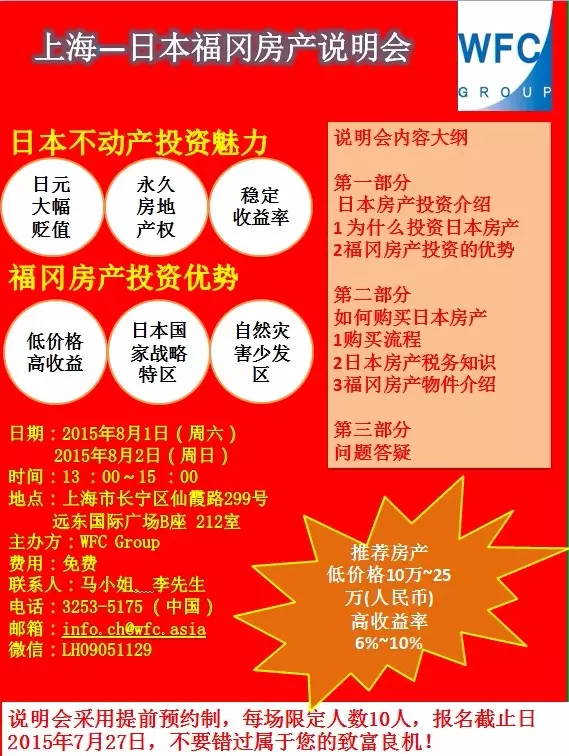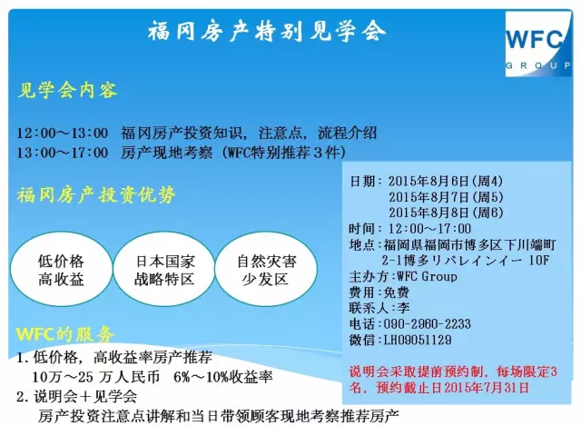 不动产公司WFC Group会定期在上海和福冈开房产说明会+当日特别推荐房产现地考察会,为您介绍福冈的高收益房产和投资日本房产的注意事项,流程等细致问题。感兴趣的朋友可以加这个公司的中国人员工微信.