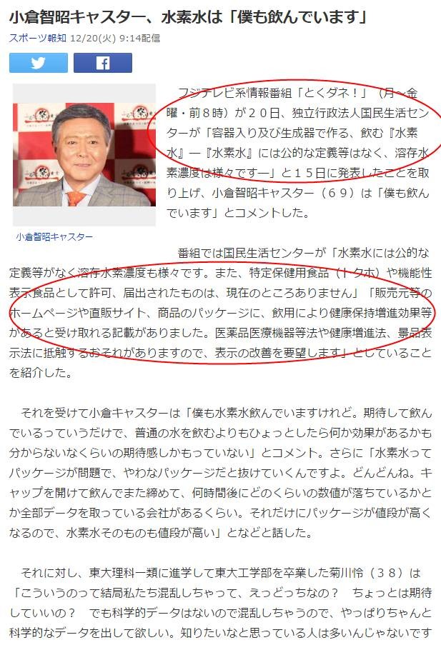 日本的电视节目及艺人们都发布了关于水素水的见解,比如日本富士电视台情报节目「とくダネ!」就做了有关于水素的讨论介绍。